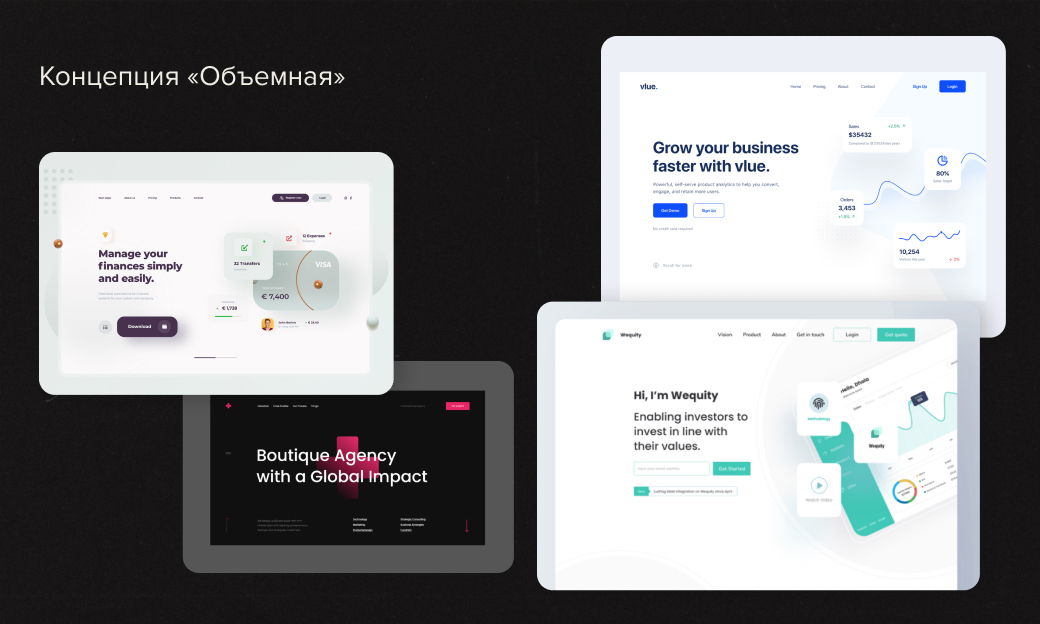 В данной концепции предлагали использовать большую типографику, сочные цвета и разбавлять всё это микро-анимациями (интерактивные элементы).